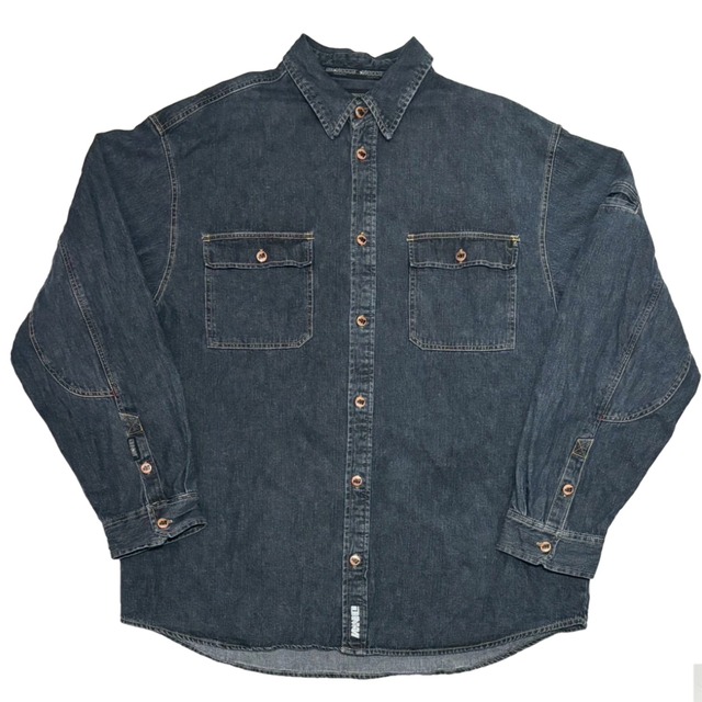 サイズXL 1990年代のヒップホップのアイコン的なブランドの1つ ビックシルエットのビックザイズ、当時のモノは細部までこだわりデザイン性の高く、ジャケット感覚で着てももらえるデニムシャツです! 着丈85 身幅68 肩幅60 袖丈67 (cm)