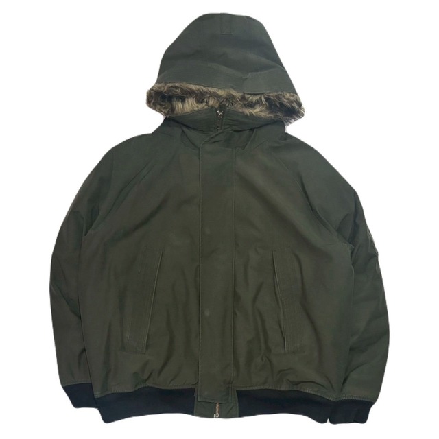 サイズM(大きめ) 90sを彷彿させるクラシックなデザインにカラー、フロント中央のジップの両脇にスウェードが貼ってあり、ファーは取り外し可! Mですがかなり大きめのシルエットです! ボタンが一個破損しています。 着丈84 身幅66 裄丈64 (cm)
