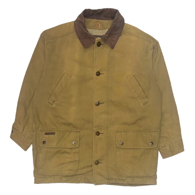 ブーツでお馴染みのティンバーランドのハンティングジャケット 襟部分がレザー製となっておりギミックも多彩、裏地の方もかなり本格的仕様、90s全開の激いなたいデザイン! 着丈85 身幅69 肩幅60 袖丈55 (cm)